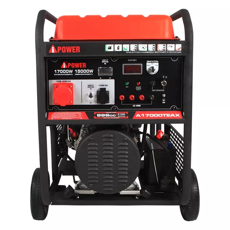 Благодаря контроллеру AVR генератор A-iPower A17000TEAX выдает максимально стабильное напряжение на выходе. Покрытие рамы и топливного бака разработано специально защиты от износа в сложных условиях эксплуатации. Альтернатор с медной обмоткой повышает надежность генератора. Розетки закрыты крышками, предохраняющими от попадания пыли и влаги, оснащены автоматами защиты, которые срабатывают при подключении чрезмерной нагрузки. Электростанция снабжена колесами и ручками для удобства перемещения по рабочей площадке.