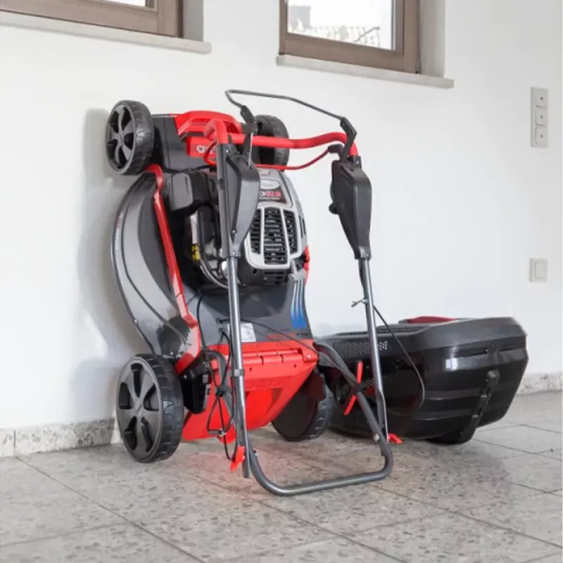 Задние колеса больше передних в диаметре. Это повышает плавность хода по неровностям, а также облегчает разворачивание бензиновой газонокосилки.