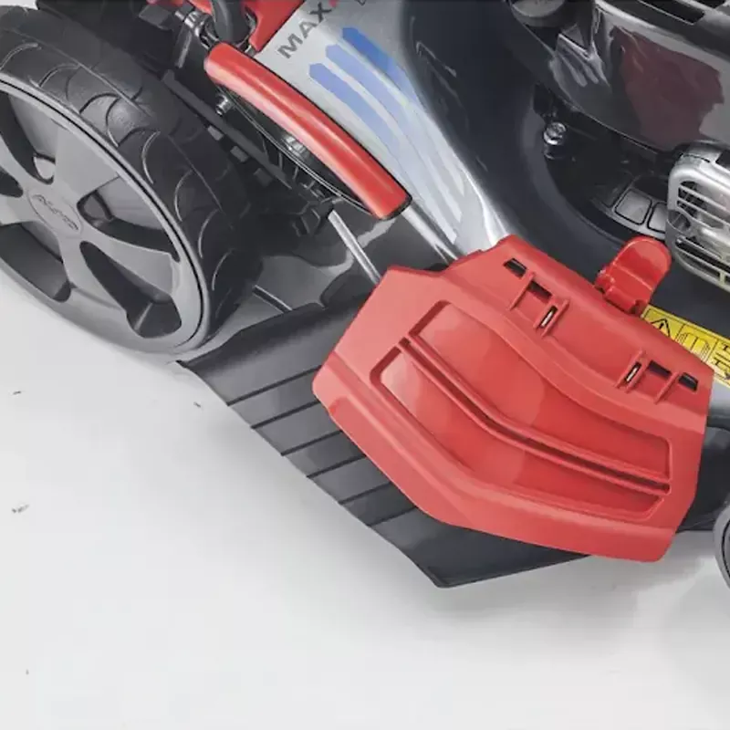 Большие колеса бензиновой газонокосилки обеспечивают плавный ход даже на неровном участке. При этом задние колеса больше передних, что облегчает разворачивание модели.