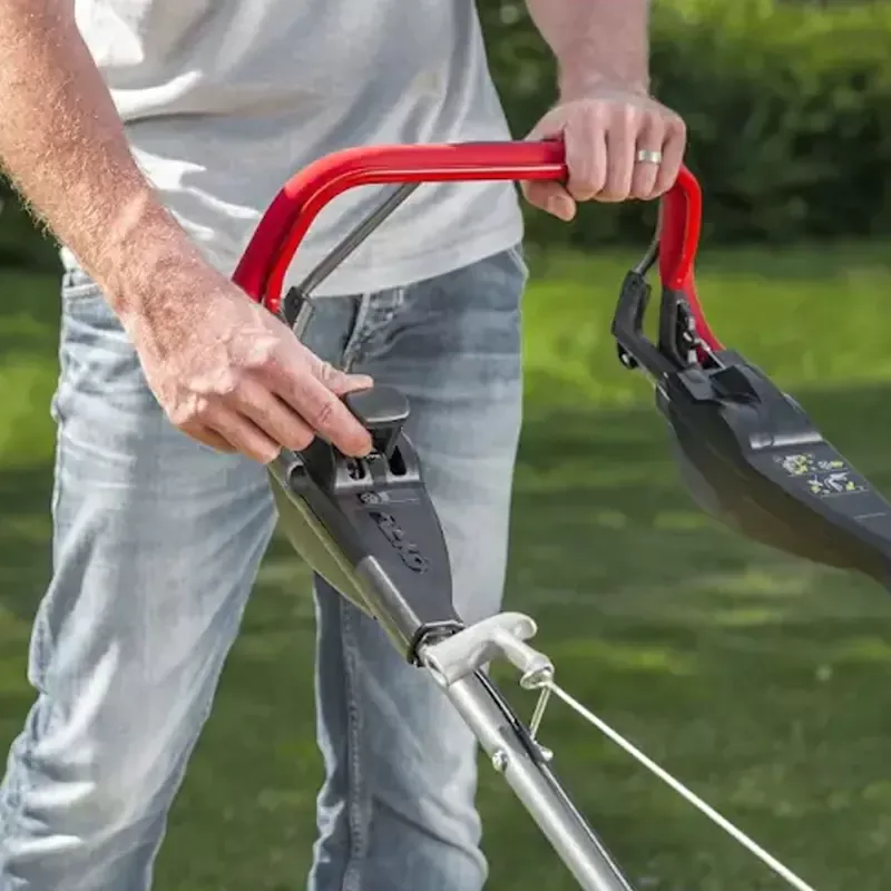 В носовой части есть транспортировочная рукоятка. За неё можно приподнять косилку, чтобы установить в вертикальное положение или перенести через ступеньки крыльца.