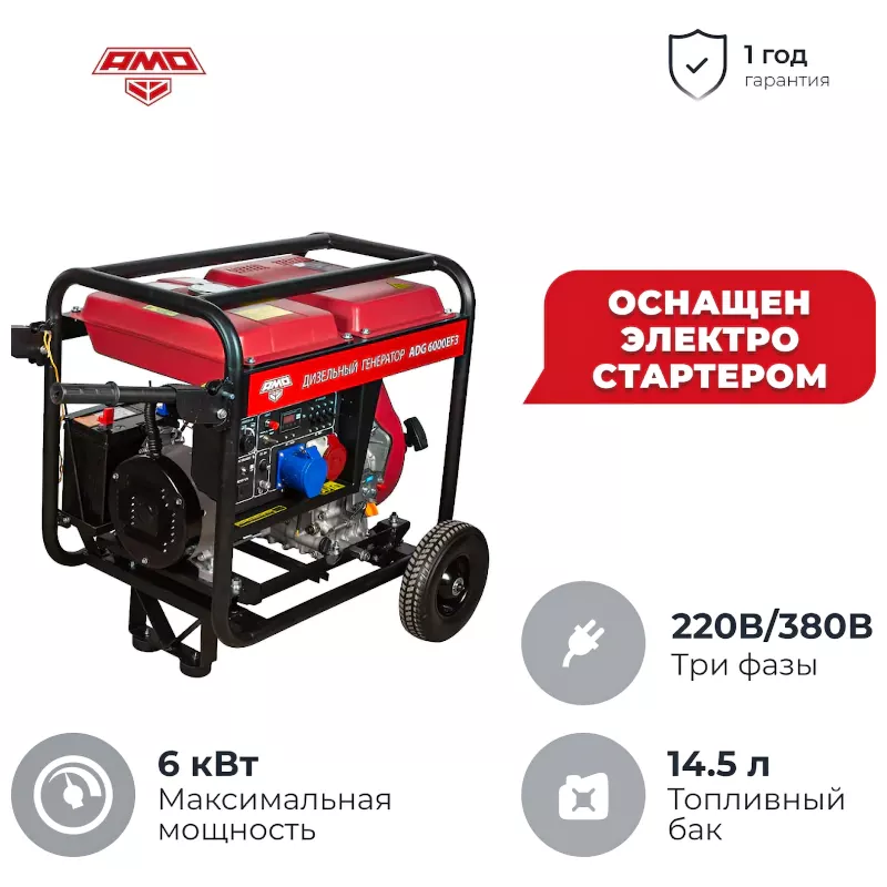 Дизельный генератор AMO ADG 6000EF3 — мобильная электростанция, смонтированная на раме из усиленного круглого профиля, оборудованная колесами и ручками для удобства перемещения. Обеспечивает автономное энергоснабжение различных электрических устройств однофазным и трехфазным током с одинаковой номинальной мощностью 5,5 кВт в обоих режимах. Генератор оснащен четырехтактным двигателем мощностью 9 л.с. с воздушным охлаждением и электростартером.