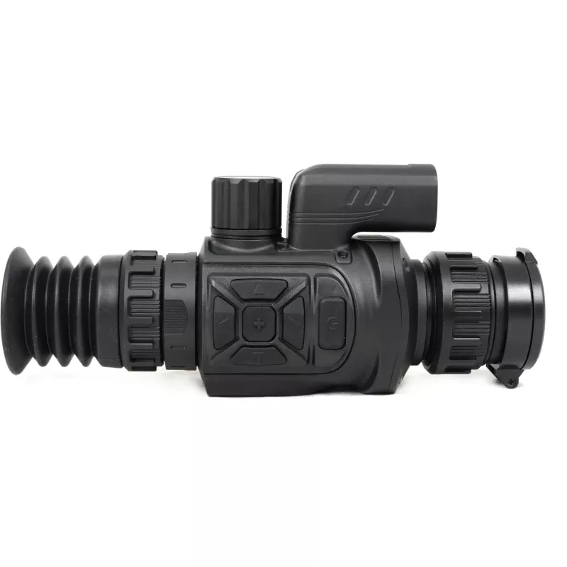 Германиевый объектив с фокусным расстоянием 35 мм и апертурой F1.0 обладает наибольшим во всей линейке прицелов показателем угла пространственного поля зрения FOV 12.5°x10°. В линейных размерах стрелок будет видеть перед собой сектор пространства размером 21,9 - 17,5 м на удалении в сто метров. Начальный уровень увеличения составляет 1,6х, для масштабирования изображения доступна функция Digital zoom, позволяющая плавно или дискретно изменять кратность в пределах от 1х до 8х. Наведение резкости изображения выполняется вручную, путем поворота низкопрофильного кольца на объективе.