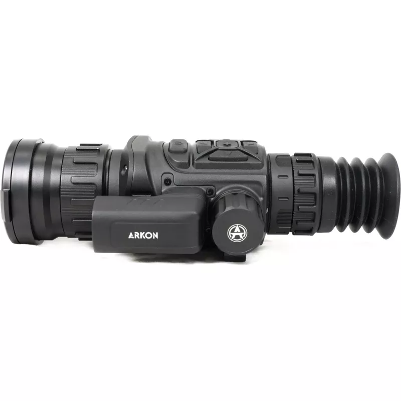 Arkon Arma HR50L оснащен мощным германиевым объективом с фокусным расстоянием 50 мм и апертурой F1.0. Начальный уровень увеличения составляет 2,4х. Для увеличения изображения доступна функция Digital zoom в пределах от 1х до 8х. Приближать картинку можно плавно и дискретно. Максимальный уровень кратности равен 19,2х. Наведение резкости на необходимую дистанцию выполняется поворотом низкопрофильного кольца на объективе. Угол пространственного поля зрения (FOV) при минимальной кратности составляет 8,8° x 7,0°, что в линейных размерах позволяет видеть сектор пространства размером 15,4 на 12,2 метра на расстоянии 100 метров. Это обеспечивает широкое поле обзора, позволяя стрелку контролировать значительное пространство перед собой и быстро оценивать обстановку на выбранной дистанции.