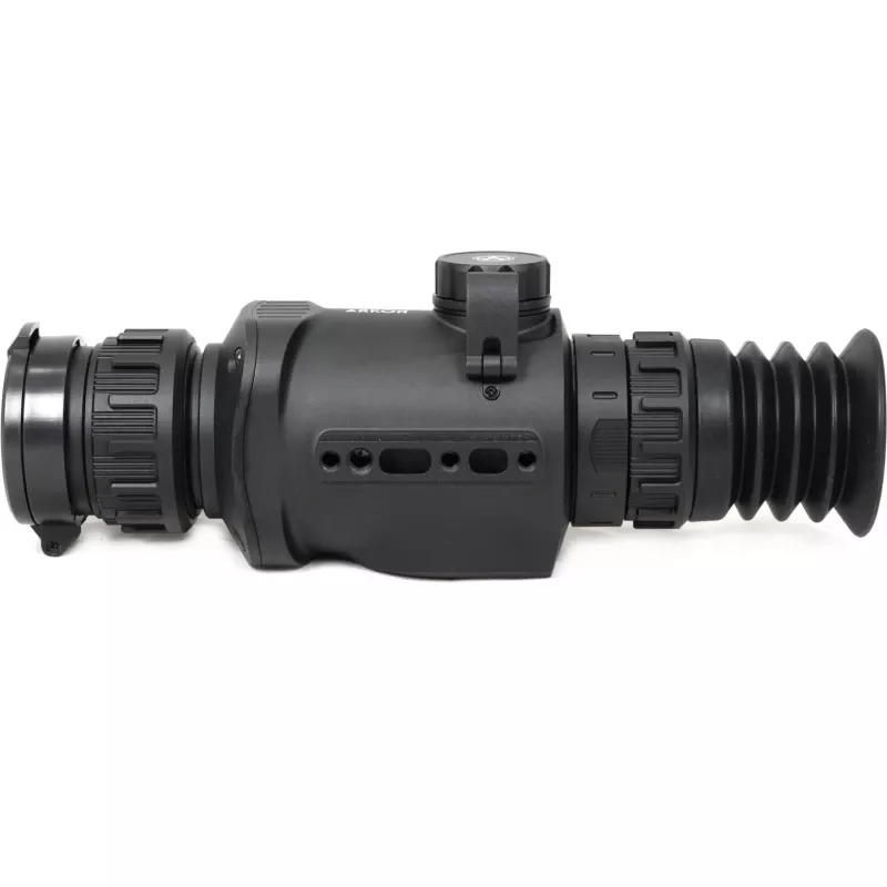 Прицел оснащен германиевым объективом с фокусным расстоянием 35 мм и апертурой F1.0. Настройка резкости на необходимую дистанцию выполняется с помощью низкопрофильного кольца на объективе. Начальный уровень увеличения составляет 3,1х. Для увеличения изображения доступна функция Digital zoom, позволяющая плавно или дискретно изменять кратность от 1х до 8х, достигая максимального значения 24,8х. При минимальном увеличении угол поля зрения (FOV) составляет 7,5° х 5,7°, что соответствует видимой области пространства размером 13,1 на 10 метров на удалении 100 метров.