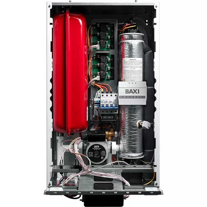 На дисплее с подсветкой отображаются рабочие параметры, такие как ступень мощности, температура теплоносителя, код ошибки и прочие. Котел функционирует по графику, указанному в настройках. Благодаря возможности установки трехходового клапана к электрическому котлу BAXI можно подключить бойлер для организации горячего водоснабжения. В этом случае становится доступной функция «антилегионелла». Она предназначена для периодического нагрева воды в контуре ГВС до высокой температуры с целью уничтожения болезнетворных бактерий и обеззараживания бака.