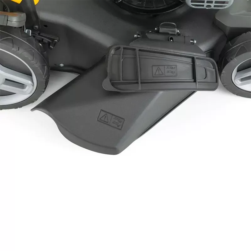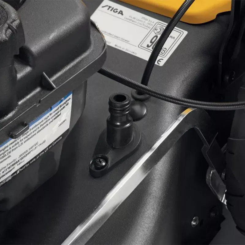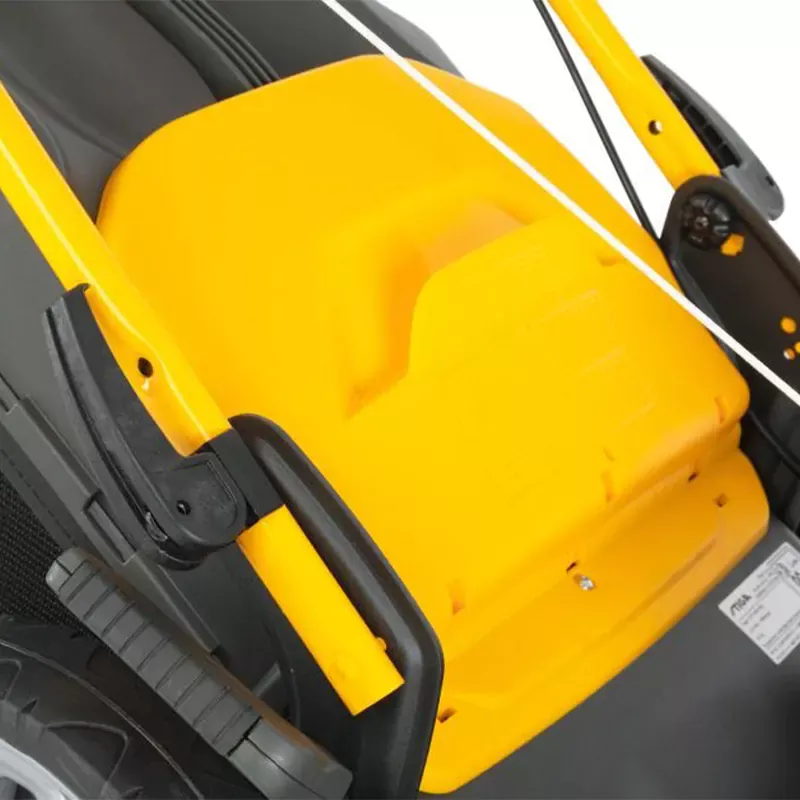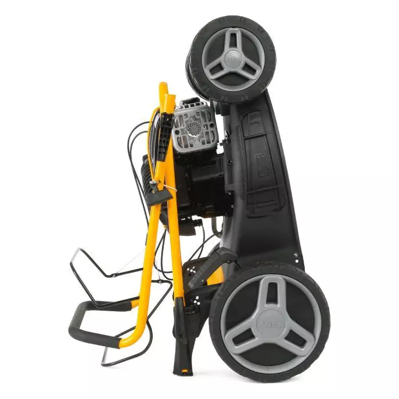 Рукоятка полностью складывается, а сама модель способна устойчиво стоять в вертикальном положении. За счет этого бензиновая газонокосильная машина займет намного меньше пространства во время хранения. Это также облегчит её погрузку в багажник легкового автомобиля.