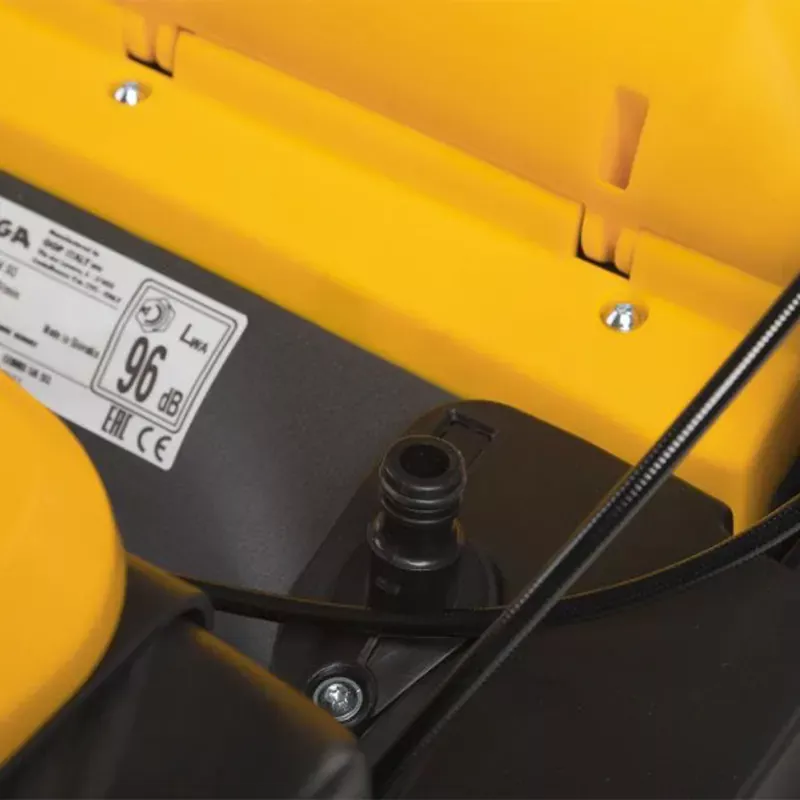 Если вы не любите тратить много времени на мытье техники, то вам понравится возможность подключения поливочного шланга к косилке. Для этого на корпусе расположен штуцер. Шасси и нож будут очищаться под струей воды.