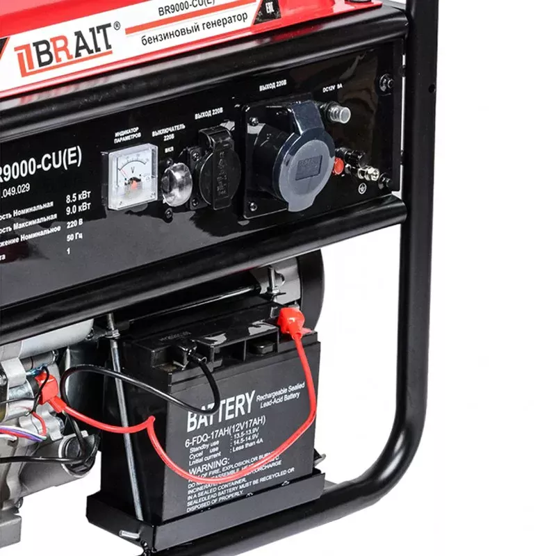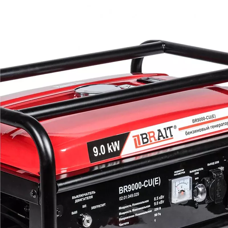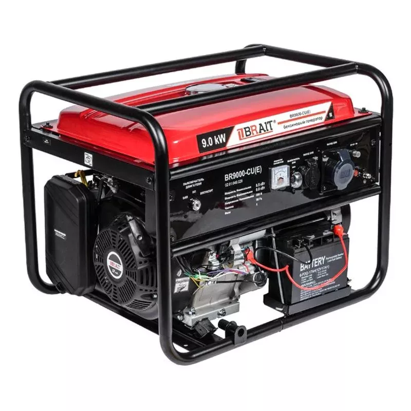 Генератор бензиновый BRAIT BR9000-CU(Е) электрозапуск Конструкция корпуса агрегата имеет надежную раму из прочных металлических труб. Это обеспечивает надежную защиту генератора. Компактные размеры и небольшой вес облегчают транспортировку и перемещение бензинового генератора, делают его положение устойчивым на любой местности.