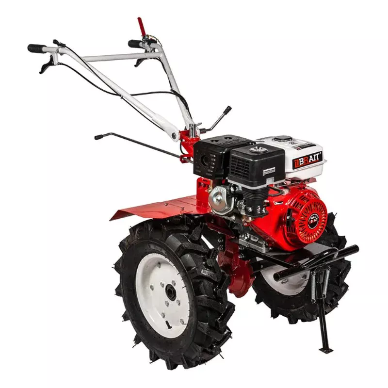 Бензиновый мотоблок BRAIT-135GA - предназначен для обработки больших участков земли. Мощность двигателя даёт возможность применять в работе широкий спектр навесного оборудования. Агрегат имеет вал отбора мощности. Мотоблок можно дополнить роторной сенокосилкой, мотопомпой, снегоуборочной приставкой и другим оборудованием. Топливный бак объёмом 3,6 литра и экономичный расход топлива, дают возможность долгое время работать без дозаправки. Высококачественная коробка передач имеет 2 скорости вперёд и 1 назад. Аппарат оснащён мощным, цельнолитым чугунным редуктором, созданным специально для эксплуатации в жёстких условиях на тяжёлых грунтах и для обработки целины. Зубчатая передача, которая сообщает крутящий момент двигателя колёсам и фрезам, отличается надёжностью и долговечностью. Сцепка мотоблока изготовлена с большим запасом прочности и позволяет работать не только с сошником, плугом или окучником, но и с телегой. Мотоблок адаптирован с навесным оборудованием КАСКАД/ЦЕЛИНА. Ширину обработки при работе с фрезами можно регулировать от 800 мм. до 1200 мм., кроме этого агрегат массой в 136 кг. способен работать плугом без дополнительного утяжеления. Шестигранные оси мотоблока (посадка 32мм.) обеспечивают надёжное соединение.