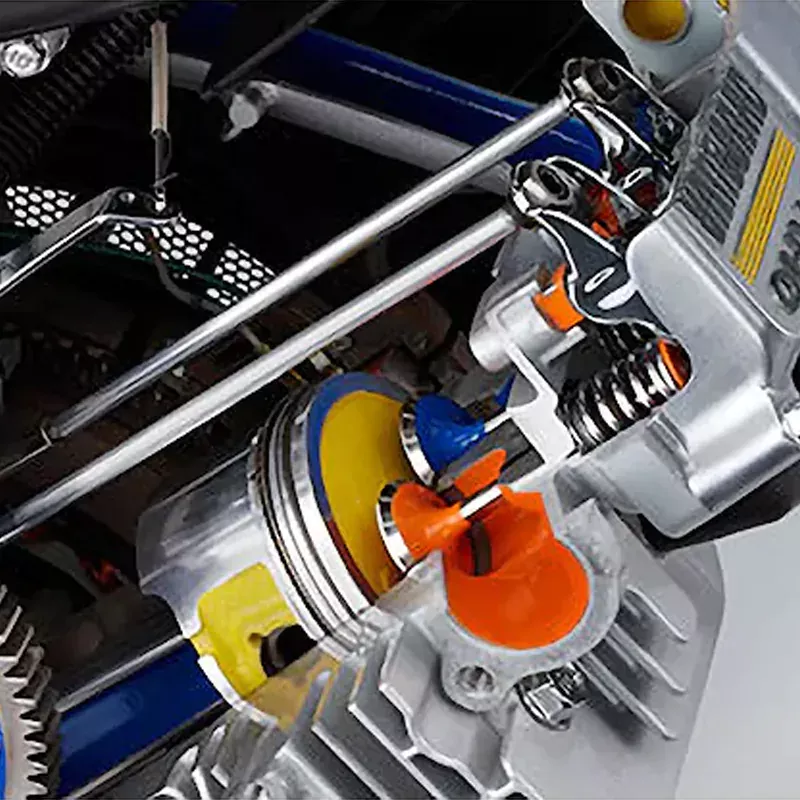 Расположенные под углом порты оптимизируют перемешивание и приготовление смеси для повышения эффективности, более плавного холостого хода, снижения выбросов и увеличения мощности.