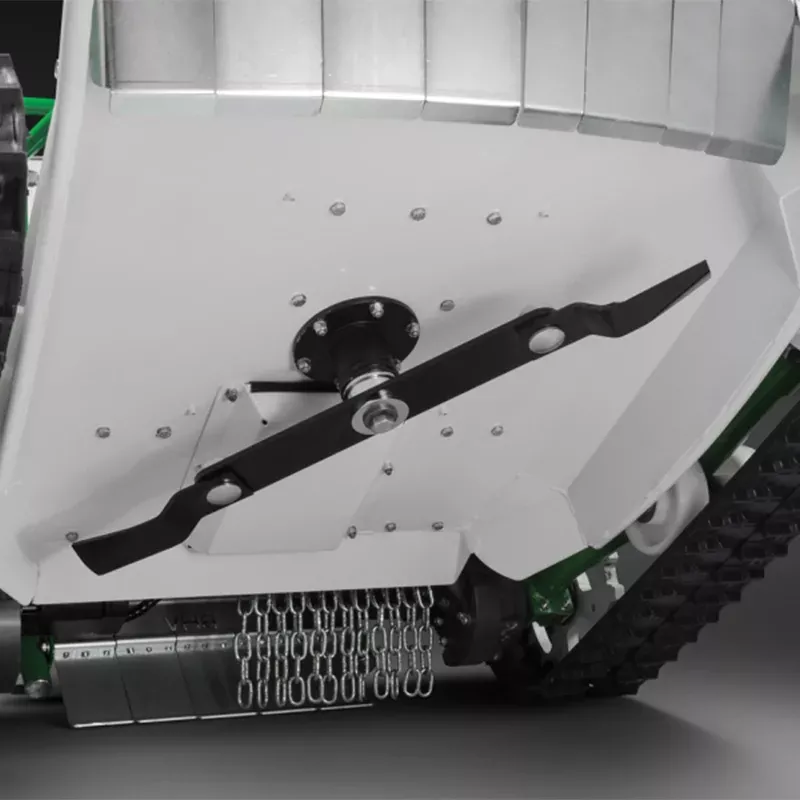 Высокая и прочная режущая дека, оснащенная ножом с плавающими наконечниками. Дека имеет конструкцию, благодаря которой машина способна осуществлять стрижку травы при движении как вперед, так и назад. Таким образом, можно избежать выполнения опасных маневров, находясь на склонах. Нож не только срезает растительность, но и перемалывает ее для ускорения биоразложения или упрощения утилизации.