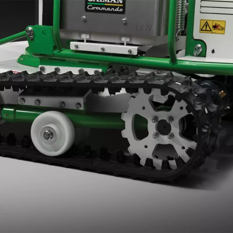 Гусеничный привод с автоматическим натяжением. Широкая поверхность гусениц позволяет обеспечить отличное сцепление с поверхностью и снизить давление на грунт, поэтому косилка способна не только срезать грубую растительность, но и работать на газоне, не оставляя на нем следов. Механизм привода оснащен автоматическим натяжителем гусеничной ленты, поэтому она не соскакивает с колес и роликов при возникновении нештатной ситуации или при растяжении в ходе длительной эксплуатации.