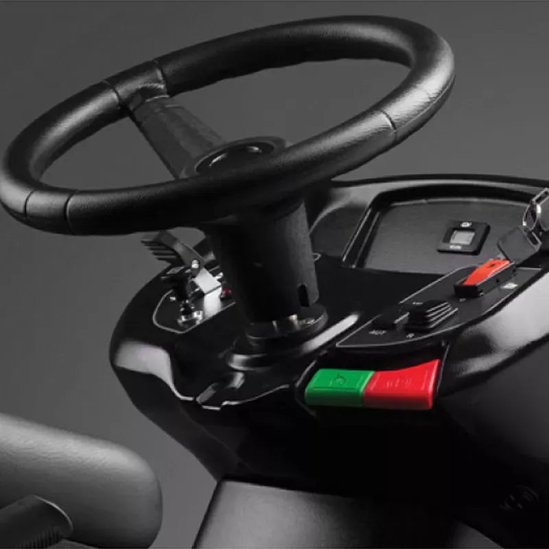 Эргономичная панель управления Для повышения уровня комфорта оператора во время работы конструкторы Caiman Comodo уделили особое внимание эргономике. На передней панели удобно размещены все органы управления: счетчик моточасов, рычаг плавного изменения скорости, кнопка включения привода деки и системы освещения. Стояночный тормоз приводится в действие простым нажатием на кнопку.
