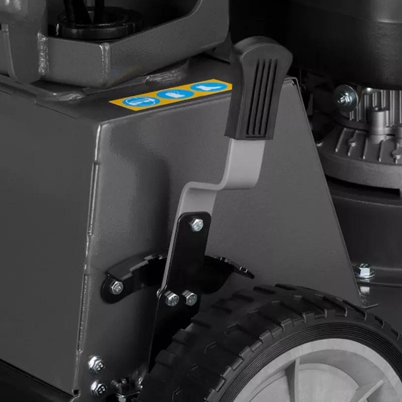 Складная рукоятка управления с регулировкой по вертикали и горизонтали Рукоять управления можно легко и быстро отрегулировать по вертикали и горизонтали, в зависимости от условий работы, для обеспечения комфорта и безопасности оператора. Регулировка рукояти вправо или влево позволяет идти рядом с машиной, не контактируя с высокой растительностью. Рукоятку можно сложить для компактного хранения или перевозки косилки.