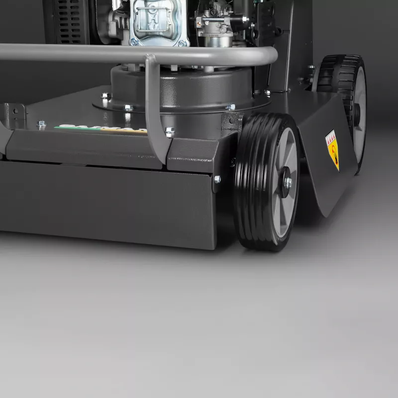 Безопасность оператора Передняя рукоятка-бампер выполняет несколько функций: защищает машину при столкновении с препятствиями, прижимает высокую траву в направлении от оператора, а также позволяет приподнять газонокосилку, не берясь за край корпуса режущей деки. Передняя металлическая «шторка» складывается внутрь деки для облегчения стрижки высокой травы и препятствует выбросу обрезков наружу.