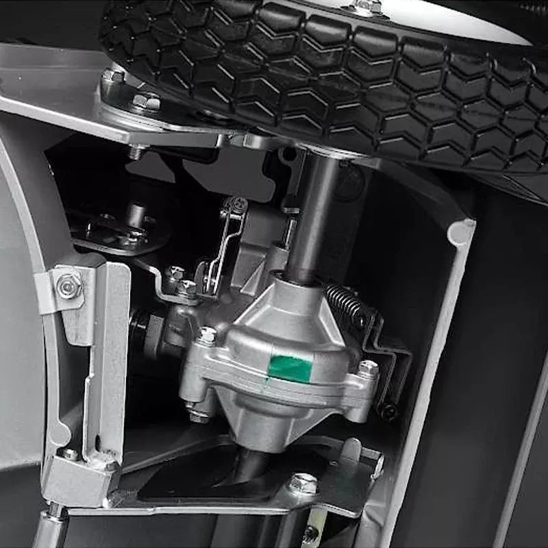 PRO трансмиссия. Облегчает оператору работу на газоне, склоне или неровных участках. Отличается высокой надежностью. Задний привод осуществляется посредством приводного вала и редуктора задней оси. Рабочая скорость стрижки травы – 1 м/с (3,6 км/ч).