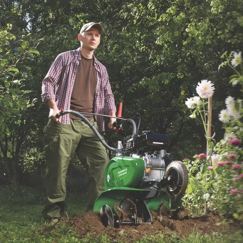 Бензиновый культиватор Caiman MOKKO 40 C2 способен обработать участок площадью до 800 м2 с глубиной вспашки 285 мм. Для удобного перемещения спереди предусмотрено транспортировочное колесо.