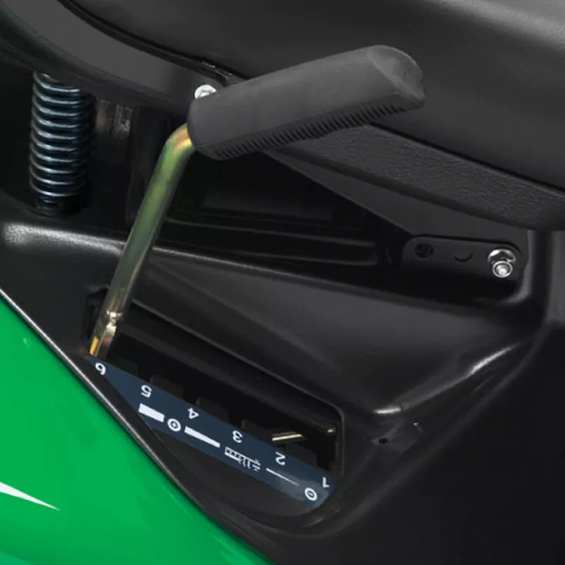 Регулировка высоты стрижки Дека имеет 7 установленных положений регулировки высоты кошения в диапазоне от 25 до 80 мм. Рычаг регулятора, расположенный под рукой оператора, имеет надежную фиксацию для избежания случайного переключения.