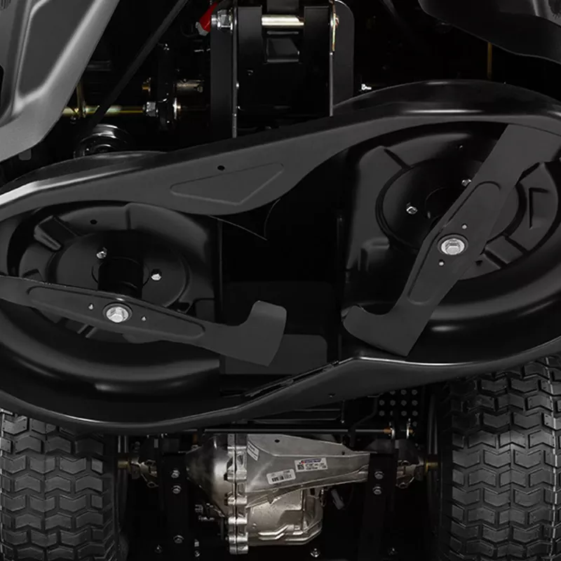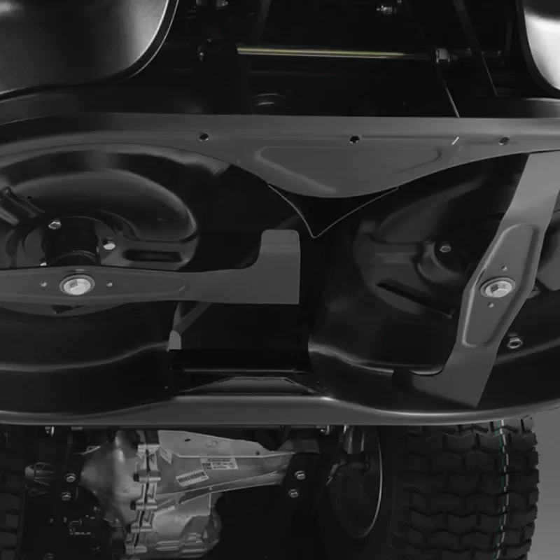 Инновационная режущая дека S-образные ножи режущей деки создают мощный воздушный поток, который перед скашиванием приподнимает траву вверх. Это улучшает подачу травы в травосборник, обеспечивает лучшую заполняемость, дает возможность сбора не только скошенной травы, но и опавших листьев. Конструкция обеспечивает высокое качество стрижки, эффективную работу в режиме мульчирования, исключает исключает образование участков нескошенной травы даже при маневрировании машины. Ножи защищены от повреждений специальными срезными шплинтами.