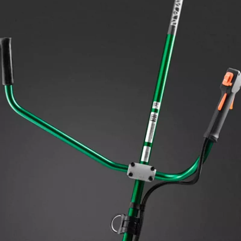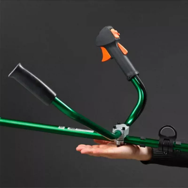 У штанги из алюминия малый вес, она не подвергается коррозии и благодаря установленным внутри бронзовым подшипникам практически не вибрирует во время работы триммера. Левая и правая части рукоятки регулируются независимо друг от друга под любое положение рук.