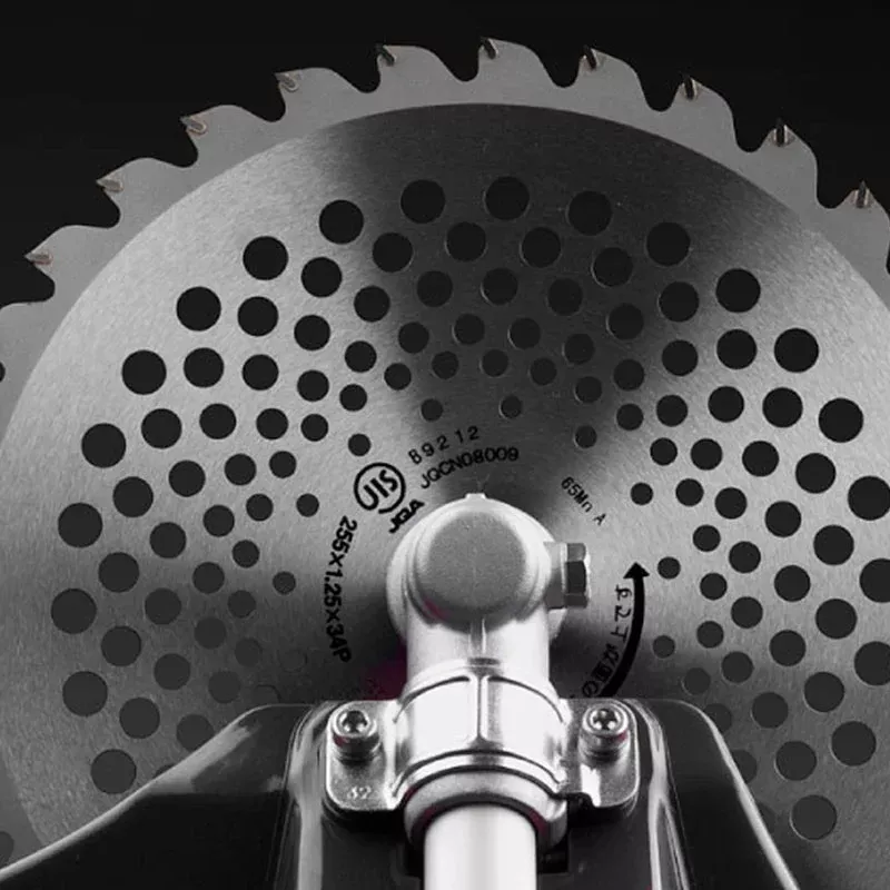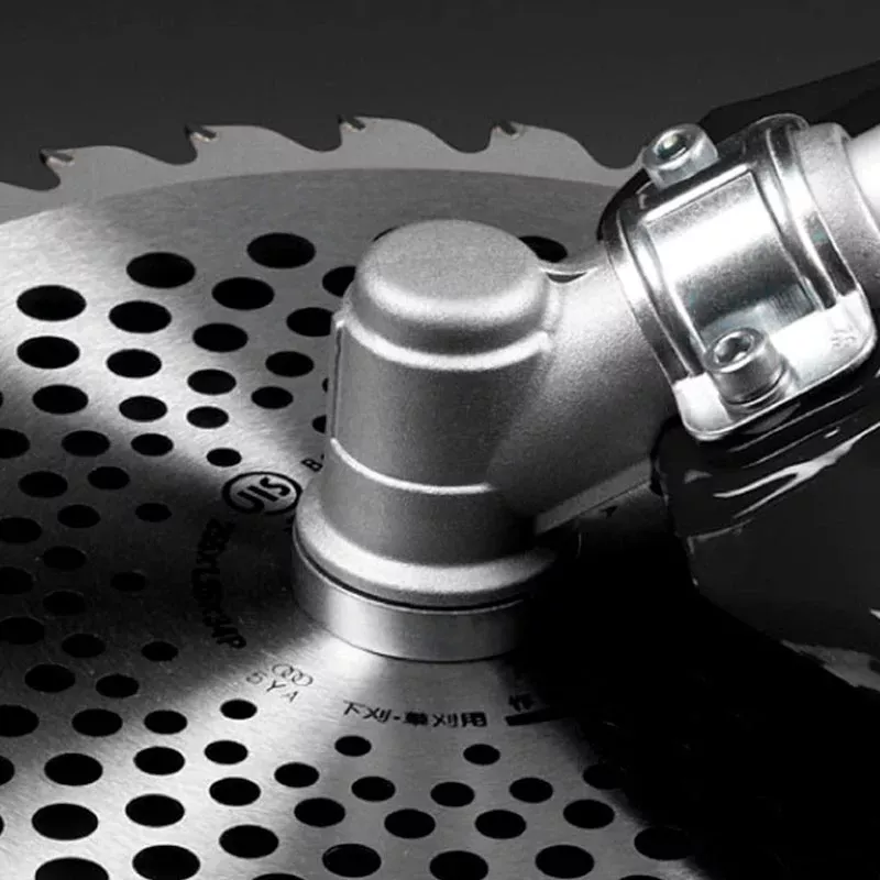 Бензиновая коса оснащена фирменным диском Katana Blade с четырьмя режущими кромками. Нож с уникальной технологией заточки пластин режет легче обычных, с меньшим сопротивлением вращению. В триммерной насадке допускается использование лески толщиной до 3 мм. Это позволяет выполнять разные виды работ: косить жесткую траву или придавать желаемый узор клумбе.
