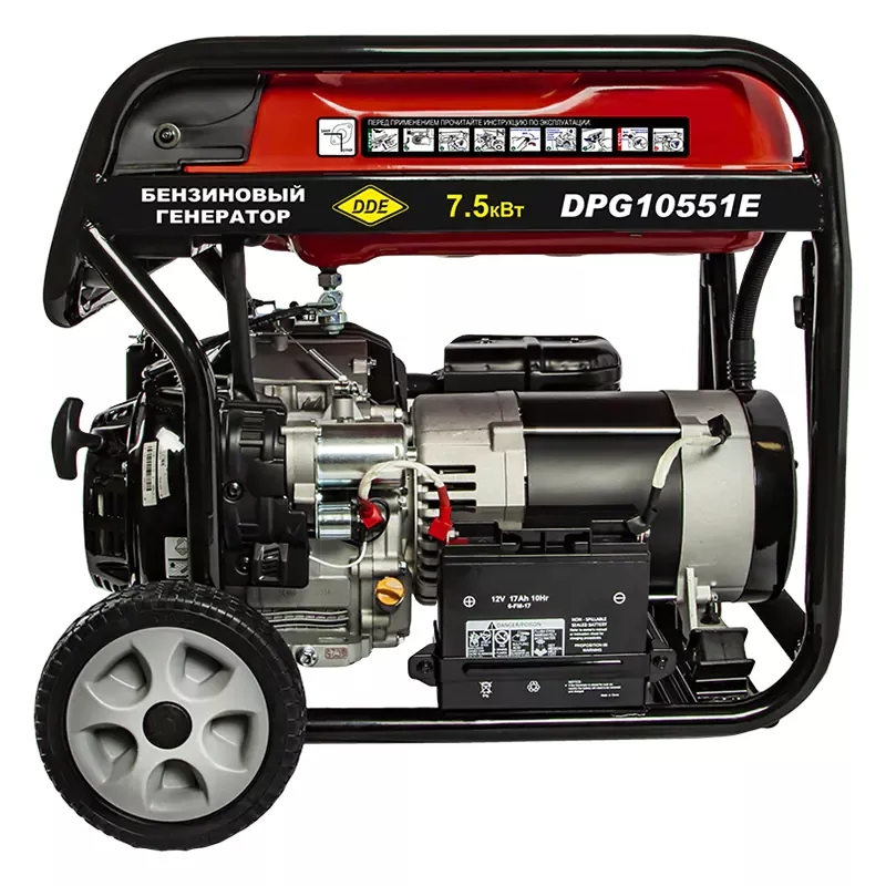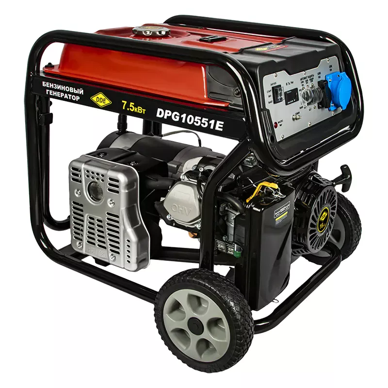 Бензиновый генератор DDE DPG10551E используется для питания однофазных потребителей суммарной мощностью до 7,5 кВт. Поставляется с транспортировочным комплектом, который включает в себя два колеса и складную рукоятку.