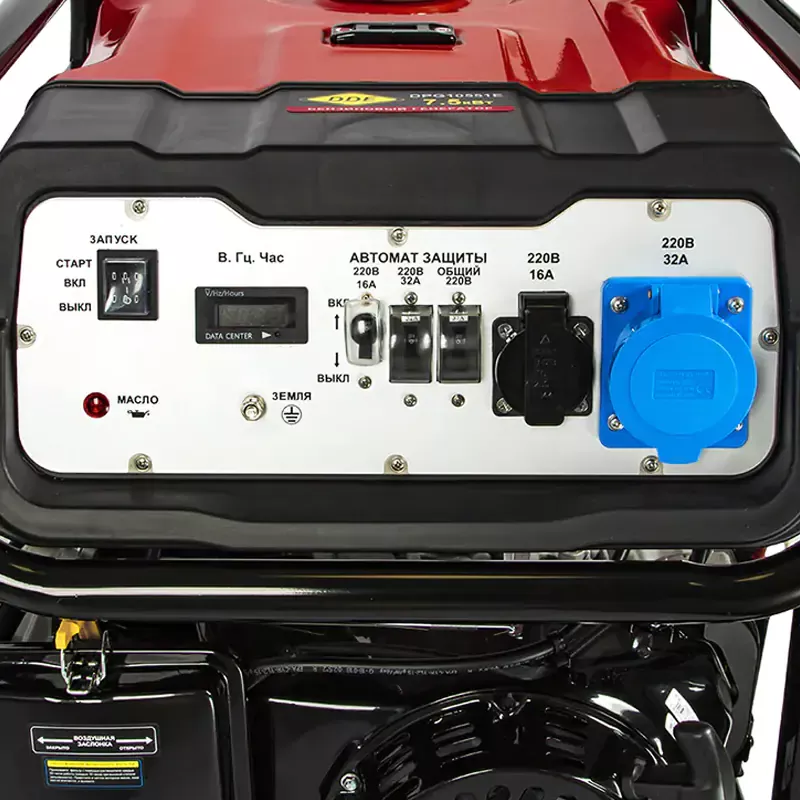 Для подключения бытовой техники и электроинструмента на панели управления размещены две розетки 220 В: на 16 А и силовая на 32 А. Каждая оснащена защитным колпачком, который не допускает попадания грязи и пыли внутрь во время хранения. Помимо этого, есть дополнительный выход на 12 В для подзарядки автомобильного аккумулятора. Небольшой расход топлива и вместительный топливный бак гарантируют непрерывную работу на полной заправке в течение 8 ч.