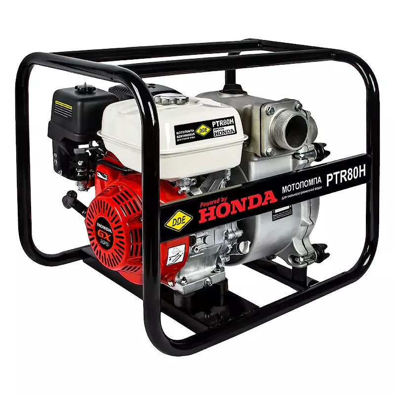Бензиновая грязевая мотопомпа DDE PTR80H обладает производительностью 1200 л/мин и позволяет работать с водой, где допустимый диаметр частиц не превышает 28 мм. Высота всасывания составляет 8 м, а напор — 27 м.