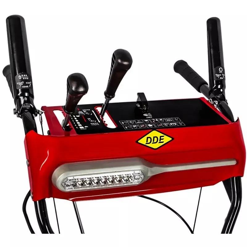 Бензиновый снегоуборщик DDE рассчитан на легкий запуск при минусовых температурах. Холодный двигатель быстро заводится с помощью ручного стартера благодаря насосу предварительной подкачки топлива в карбюратор. В некоторых случаях удобно воспользоваться электрозапуском от электрической сети. Все рычаги и рукоятки управления расположены под рукой. Дальность и направление выброса снега регулируются с панели оператора.