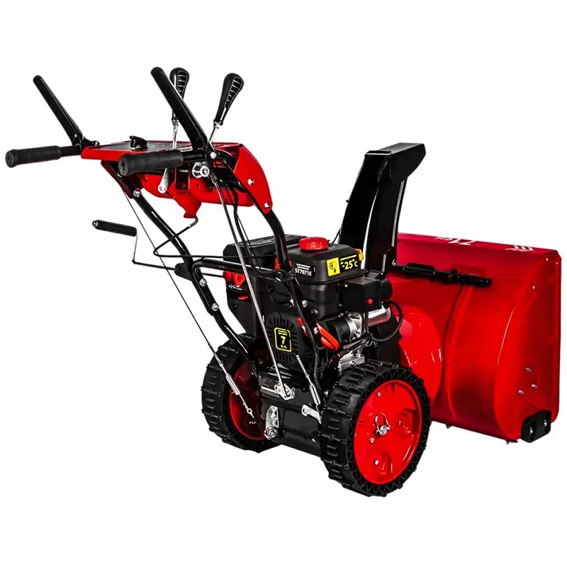 Бензиновый снегоуборщик DDE ST7071E с яркой фарой и удобной панелью оператора поможет быстро и без излишних усилий расчистить участок перед домом или проложить пешеходные дорожки после сильного снегопада. Металлический шнек с легкостью врезается в снежную толщу и направляет ее в разгрузочный желоб. Дальность выброса достигает 11 м. Снегоуборочная машина оснащена четырехтактным двигателем мощностью 7 л.с., который заводится с помощью ручного стартера или электрозапуска от сети 220 В. Ширина обработки составляет 71 см.