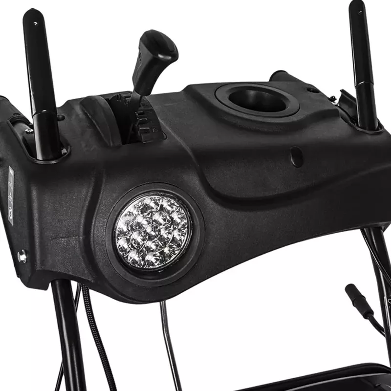 Яркая фара обеспечивает не только удобство работы в условиях плохой освещенности, но и безопасность во время уборки вблизи проезжей части. Закрепленная на корпусе лопатка помогает очищать шнек и желоб от засоров и наледи.
