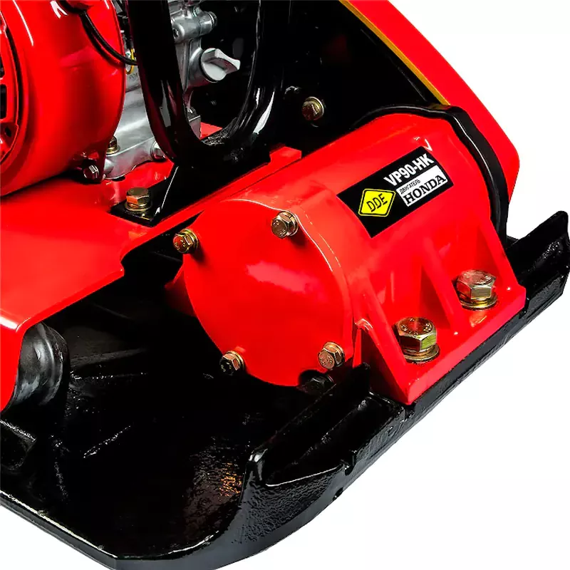 Литое чугунное основание виброплиты DDE VP90-HK рассчитано на большие нагрузки. Двигатель и другие важные силовые узлы надежно защищены от случайных повреждений стальной рамой. Ременная передача закрыта специальным кожухом. За счет этого в движущийся механизм не попадет камень или щебень. На роторе вибратора установлены втулки из стали. Все это обеспечивает длительный срок службы машины.