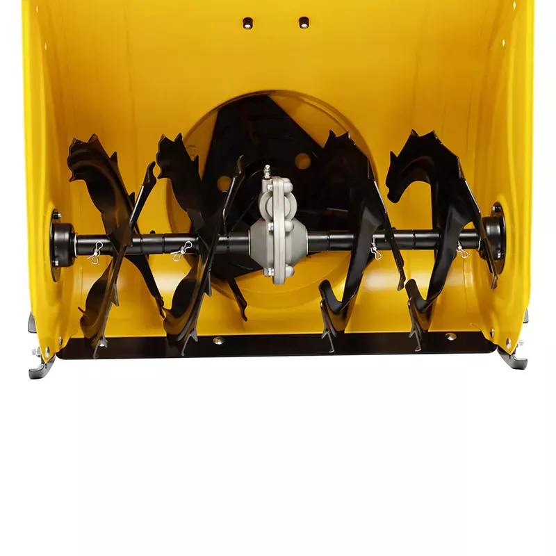Снегоуборщик оборудован прочными стальными шнеками с агрессивным профилем ледорубов. Благодаря этому модель справляется даже с твердыми обледеневшими комками снега.