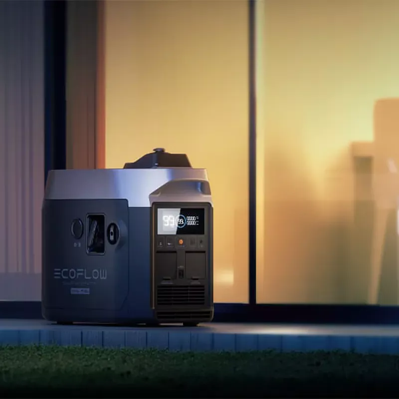 Двухтопливный генератор EcoFlow Smart Generator мощностью 1800 Вт может работать как на бензине АИ-92, так и на сжиженном газе. Совместим с зарядными электростанциями EcoFlow DELTA Pro и DELTA Max, а также системами Power Kit.