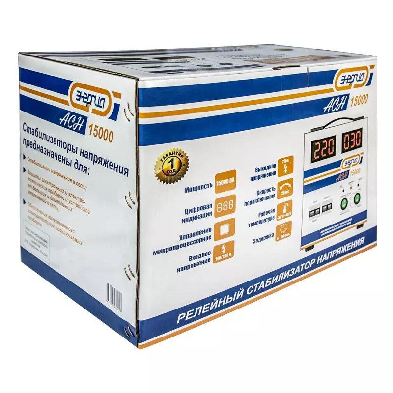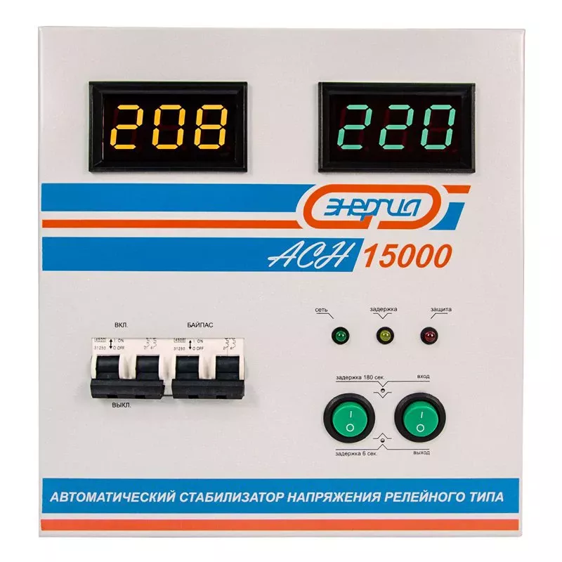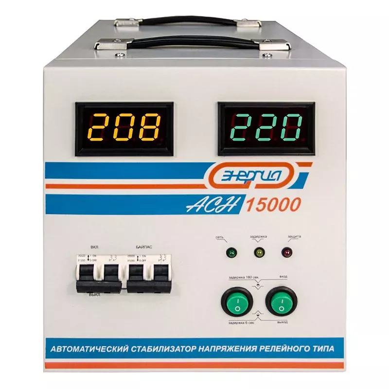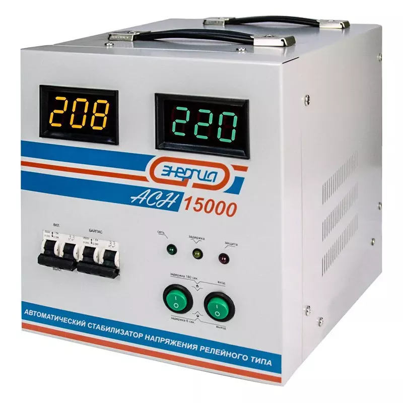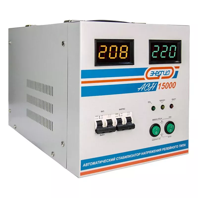 Релейный однофазный стабилизатор напряжения переменного тока предназначен для стабилизации переменного напряжения в сети электроснабжения для потребителей бытового и аналогичного назначения. Изделие относится к классу автотрансформаторных стабилизаторов со ступенчатым регулированием напряжения путем переключения отводов силового автотрансформатора с помощью электромеханических силовых реле, таким образом стабилизаторы Энергия АСН регулируют напряжение по релейному принципу.