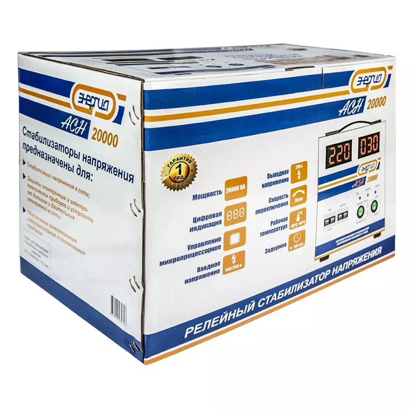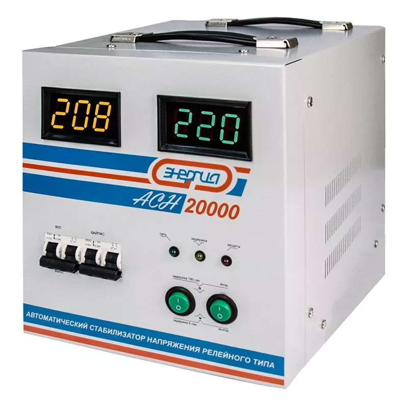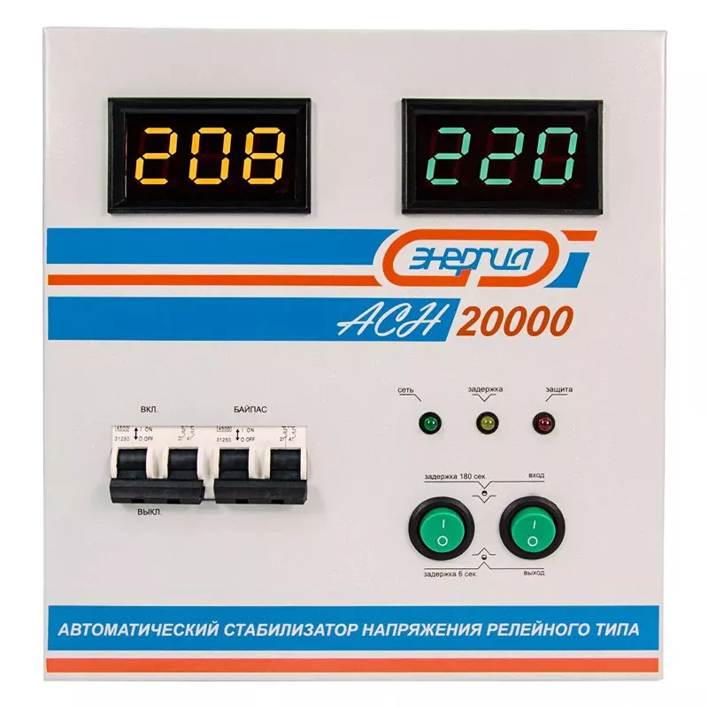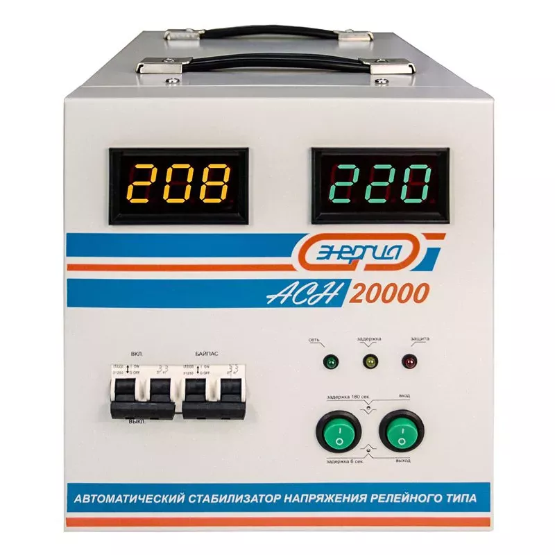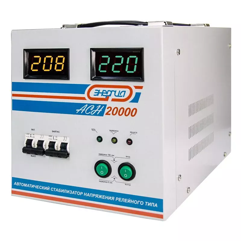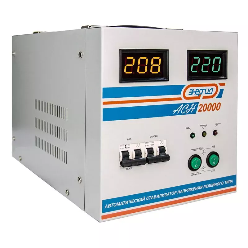 Релейный однофазный стабилизатор напряжения переменного тока предназначен для стабилизации переменного напряжения в сети электроснабжения для потребителей бытового и аналогичного назначения. Изделие относится к классу автотрансформаторных стабилизаторов со ступенчатым регулированием напряжения путем переключения отводов силового автотрансформатора с помощью электромеханических силовых реле, таким образом стабилизаторы Энергия АСН регулируют напряжение по релейному принципу.