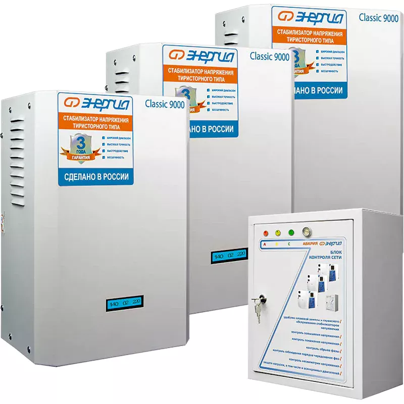 Комплект тиристорных стабилизаторов напряжения Энергия серии Classic 9000 предназначены для обеспечения стабилизированным питанием трехфазных потребителей.