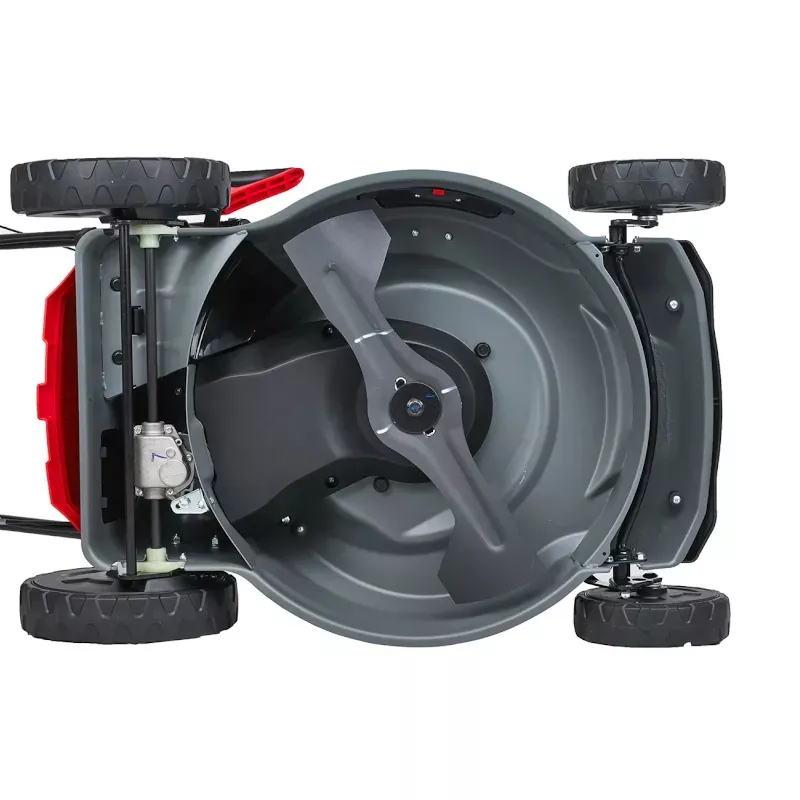 - Шасси с увеличенными задними колесами и дерновым протектором малой глубины для бережного перемещения по травяному покрову и устойчивости на рельефной поверхности;