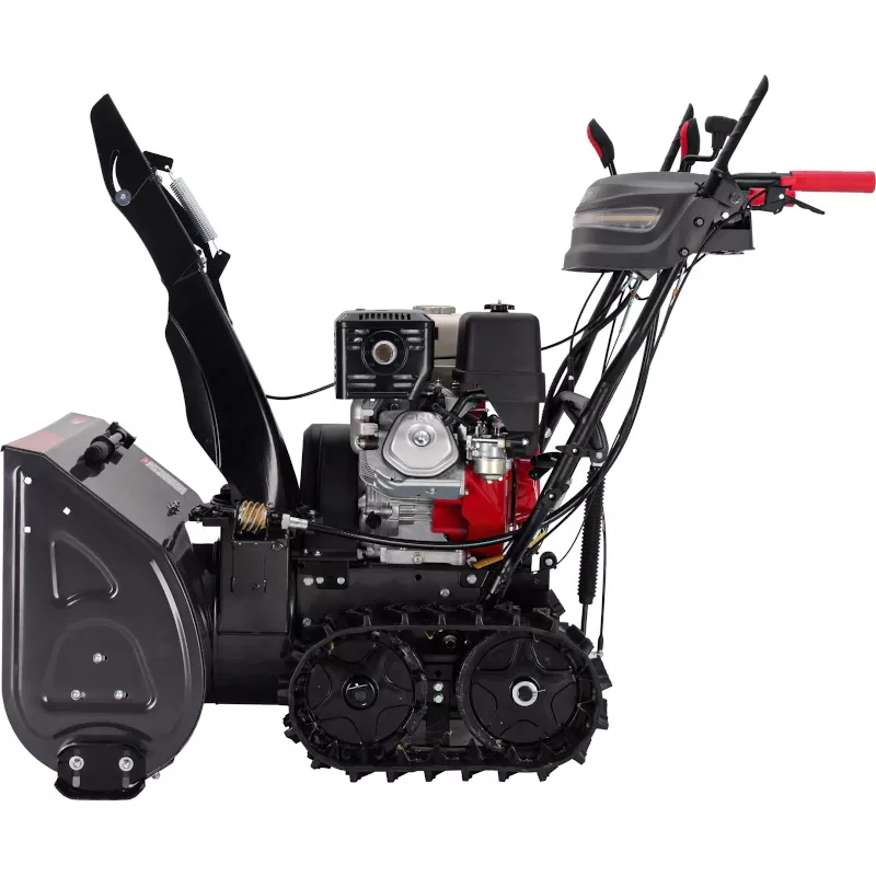Снегоуборщик справляется с расчисткой территории от снежных завалов благодаря мощной двухступенчатой системе уборки. Острые зубья шнека перемалывают снежную массу любой плотности. Снег подается на крыльчатку и отбрасывается через разгрузочный желоб на большое расстояние. В зависимости от плотности снежного покрова можно выбрать удобную скорость перемещения снегоуборщика. Благодаря гусеничному механизму машина отличается хорошей проходимостью — не скользит и не пробуксовывает.Управление одной рукой
