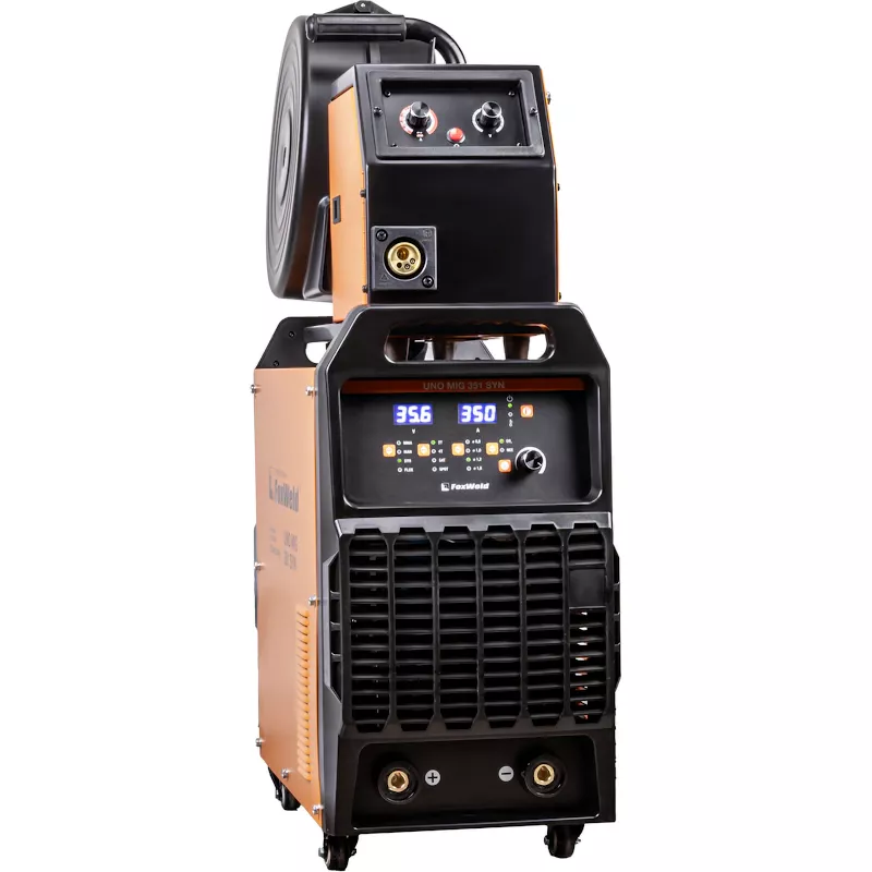 Сварочный полуавтомат инверторного типа FOXWELD UNO MIG 351 SYN с синергетическим управлением предназначен для широкого использования в отраслях по производству металлоконструкций, в сервисных металлоцентрах, при ремонте и восстановлении. FOXWELD UNO MIG 351 SYN позволяет производить сварку изделий из низкоуглеродистой и легированной стали и алюминия. Максимально надёжная сварочная установка с отдельным 4-роликовым полноприводным механизмом подачи проволоки идеально подойдёт для стационарного рабочего места сварщика.
