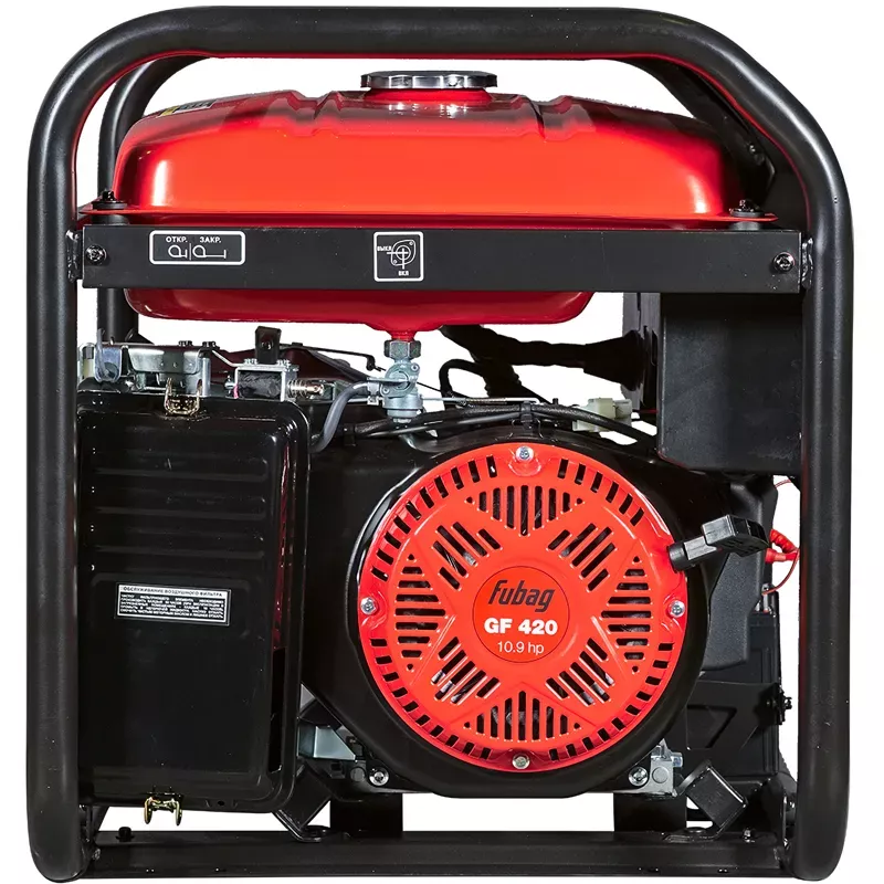 Автоматический предохранитель срабатывает в случае короткого замыкания или перегрузки, прекращая выработку тока. Индикатор на крышке бензобака напоминает о необходимости заправки генератора FUBAG BS 6600.