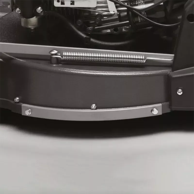 Благодаря заднему упору газонокосилку (даже заправленную бензином и маслом) можно поставить вертикально, сняв с нее травосборник. Это облегчает уход (очистку внутренней части деки, обслуживание ножа), хранение и перемещение.