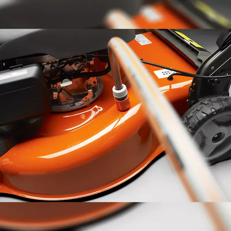 На корпусе есть штуцер для поливочного шланга, который способствует быстрой очистке деки.