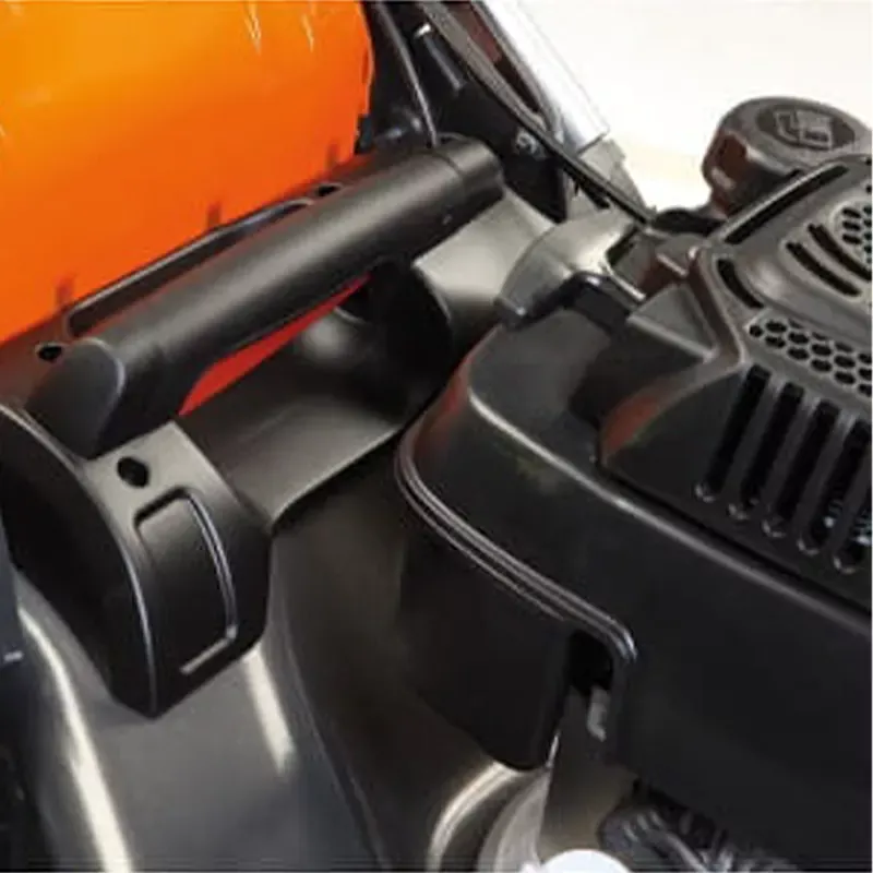 - Передний бампер с рукояткой для переноски. Рукоятки на переднем бампере и в зоне регулятора высоты стрижки облегчают погрузку-разгрузку газонокосилки и позволяют не касаться руками внутренней части корпуса деки.