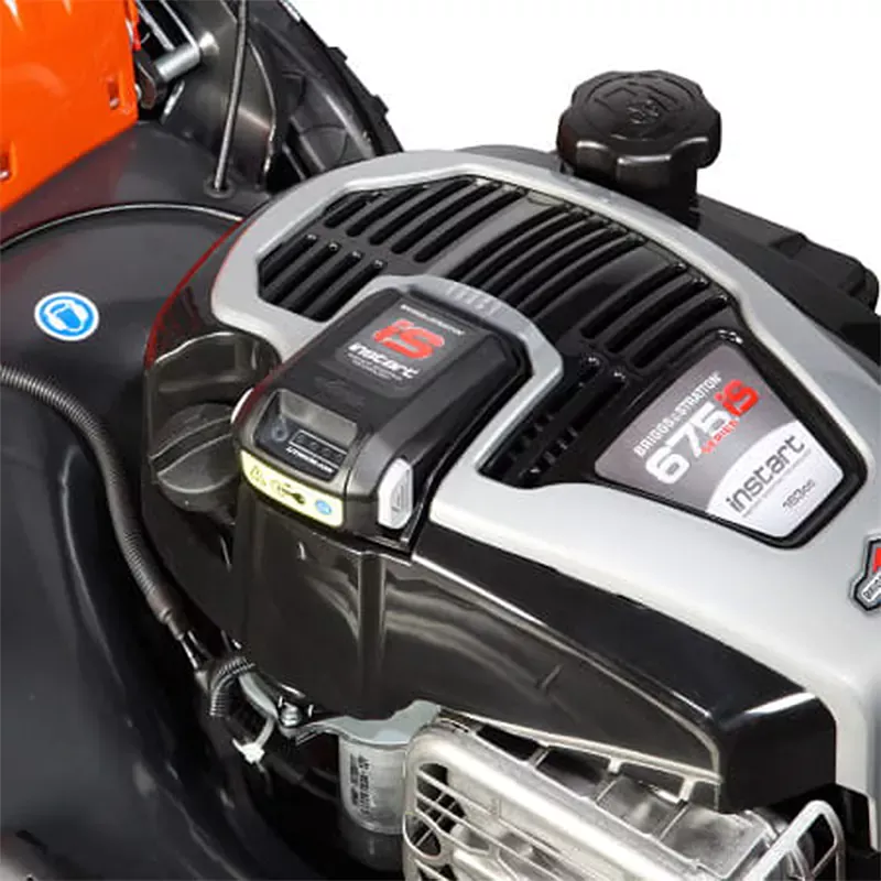 - Двигатель Briggs & Stratton 675 iS OHV series™ (США) с системой InStart. Это не только высокая мощность, производительность и долговечность. Это еще и самый легкий запуск, который может быть у газонокосилки. Серия iS оснащается литий-ионными аккумуляторами для моментального пуска, без необходимости дергать за рукоятку стартера. Аккумулятор съемный, 1 часа зарядки хватает на 50 пусков.