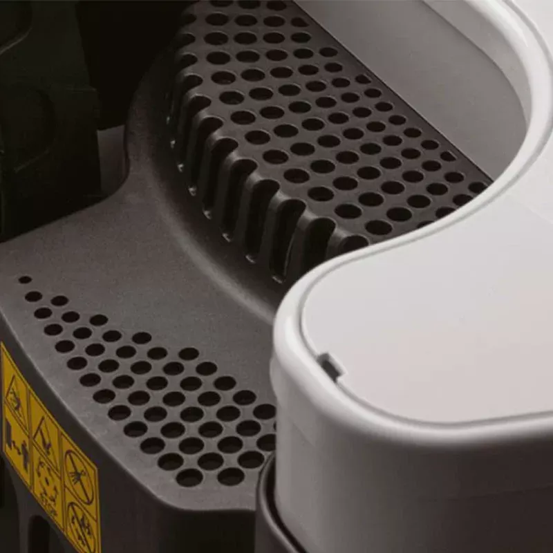 Новый дизайн предполагает большую автономию: перфорированный корпус и нож обеспечивают быстрое и безопасное удаление частиц травы из-под корпуса.
