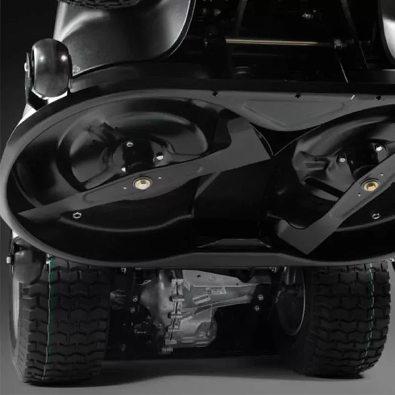 Ножи деки расположены под углом 90 градусов по отношению друг к другу, чтобы приподнимать траву и срезать ее максимально ровно, без пропусков.