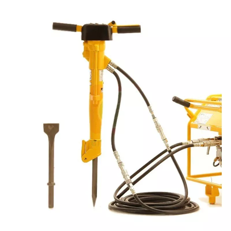 Гидравлический отбойный молоток Caiman BH161V в комплекте с пикой - ручной инструмент для разрушения асфальта, бетона или работ по трамбовке (при использовании соответствующих наконечников, которые приобретаются отдельно). Молот работает от гидравлической станции Caiman, но его можно запитать от другого источника, например, гидросистемы мини-экскаватора.