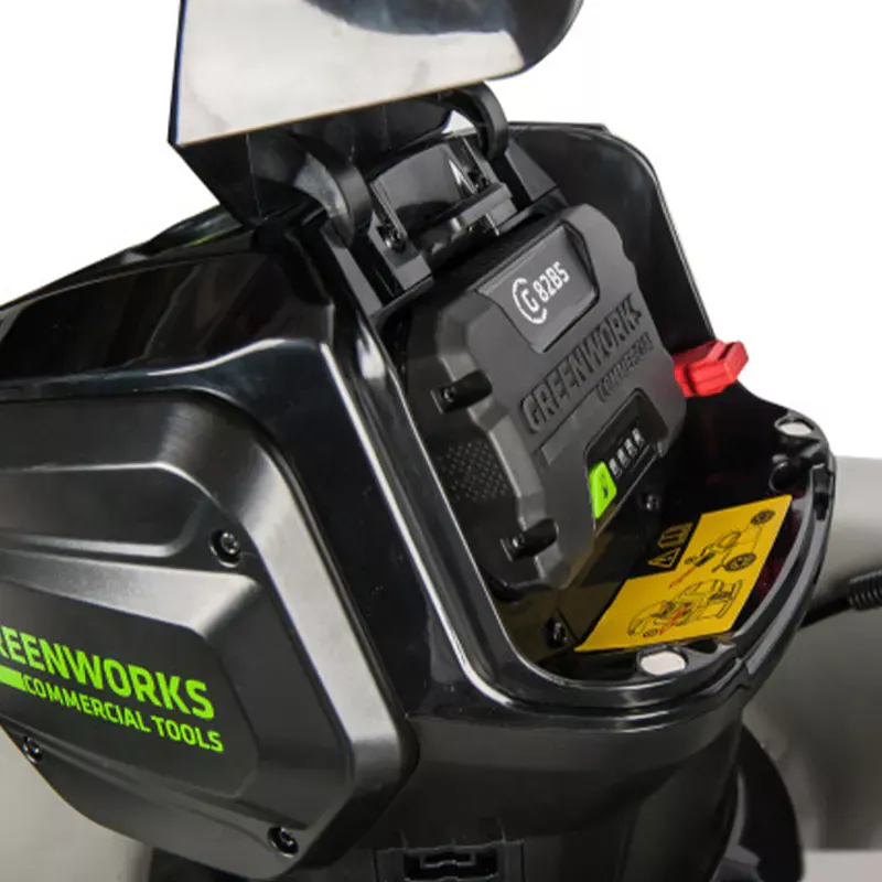 - Газонокосилка работает от аккумуляторной батареи 82V Commercial, которую можно использовать другими с устройствами линейки 82V.