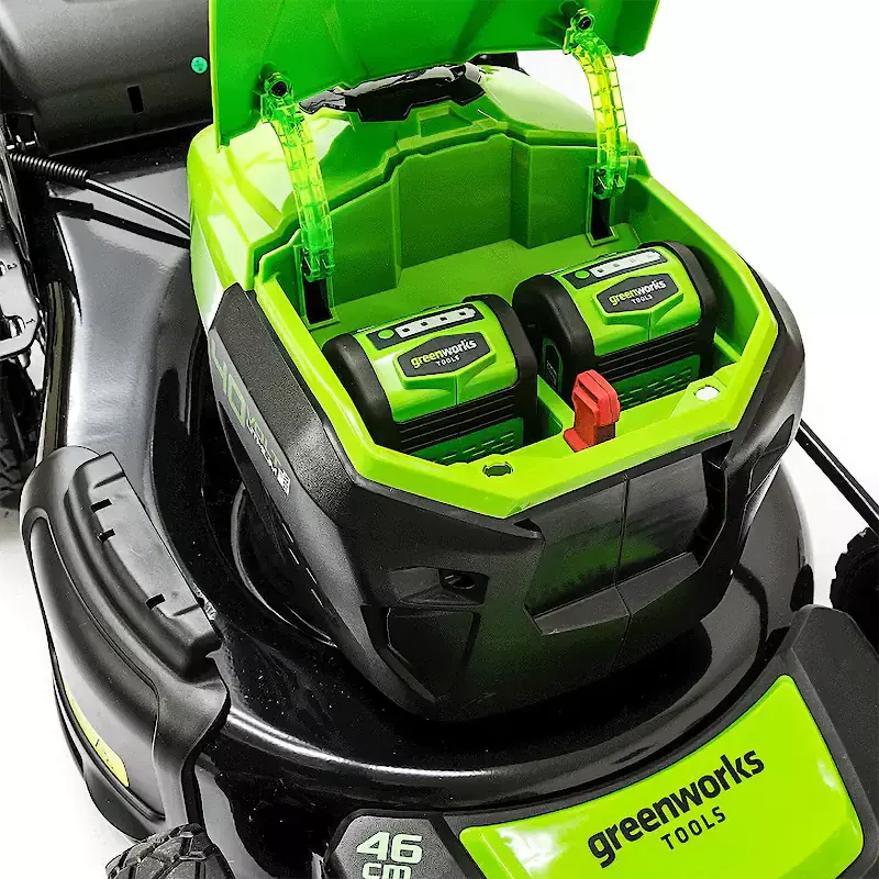 Газонокосилка имеет один отсек питающего аккумулятора и дополнительный отсек для хранения запасного аккумулятора. Когда основной аккумулятор разряжается, вам не нужно идти за новым — достаточно просто поменять аккумуляторы местами.